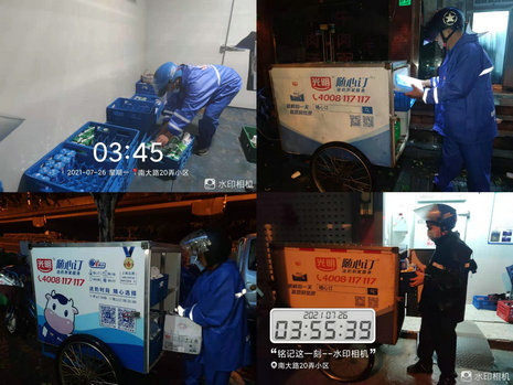 凌晨三点,在太陽城APP 随心订各奶站内,送奶员们正在忙着分拣牛奶,而块长则忙着嘱咐即将要出发的送奶员们,让大家出行一定要注意安全,要戴好头盔注意高空坠物,要注意路面积水和倒下的树枝,要控制车速防止车辆打滑。宫青龙是上海南三区梅陇块奶站的一名党员送奶员,宫师傅说:“虽然天气恶劣,但有许多市民都在等着我们送奶,尤其是老人和孩子,如果我们不送,他们今天就很可能喝不上奶,我们再难也要送,一定不能让市民断奶。”