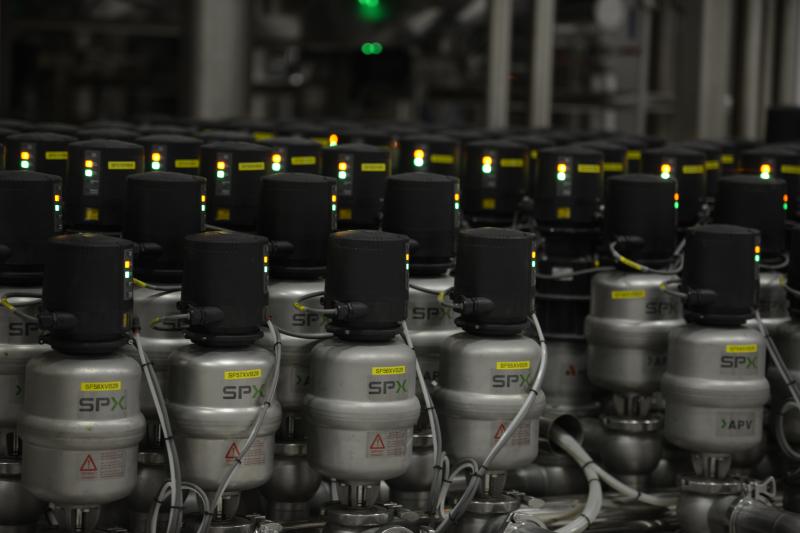 “阀门阵”的作用,在原奶预处理区能直观感受:整个预处理区有将近1万个阀门。来自牧场的原奶通过封闭式管道进入生产车间,阀门就承担起“防混”和“分配”的任务,把原料根据生产计划输送至生产巴氏鲜奶、酸奶、常温奶等不同乳制品的生产线。