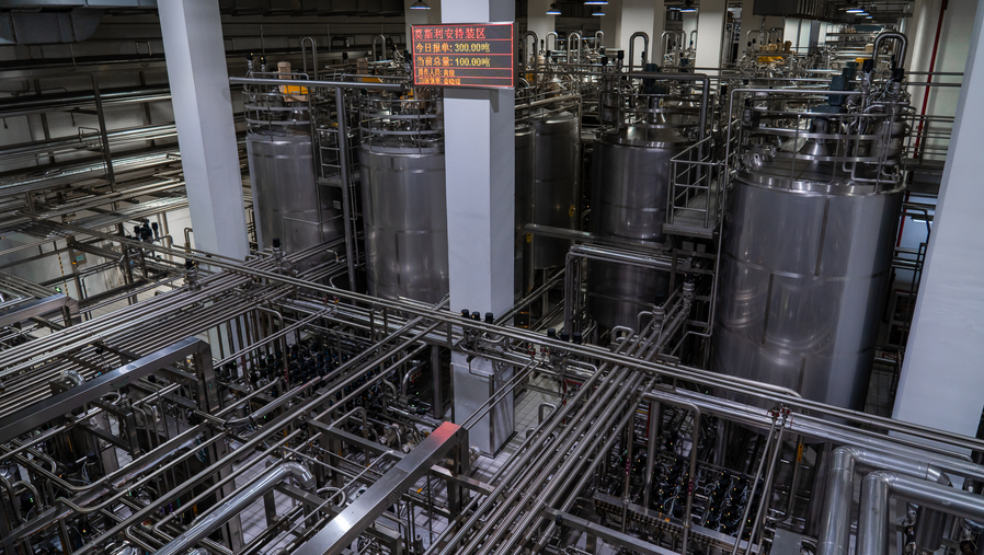 走进工厂参观通道、隔着玻璃窗望向生产车间,记者才知道,“看不到奶”并不夸张——面前是一座由一个个巨大储料罐、一条条管道构成的“无人工厂”,从原奶入厂到成品奶出厂,没有一个手工环节。谢朋军揭秘:这是数字化解决方案的成果,整个生产车间里一共有1.8万个自动控制阀,它们构成了目前国内乳业单体车间最大的“阀阵”。在数字化系统操控下,控制阀根据不同生产环节,自动调整方向,将原料送往指定的管道和储料罐。