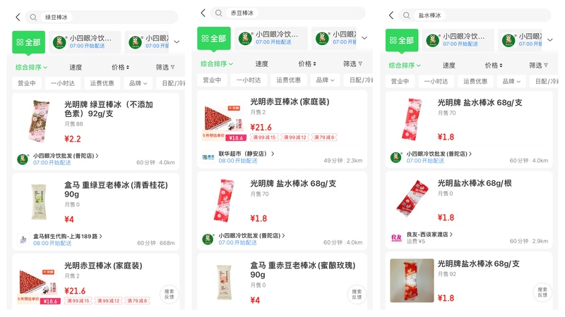 同时,对于部分市民想“买棒冰”的想法,部分商超卖场也和电商联手,通过O2O服务,提高便捷性。例如,京东到家既与商超卖场、便利店合作,也与社区烟纸店、冷饮批发店合作,将各种冷饮上网。记者以“棒冰”为关键词搜索,平台立刻显示出附近有棒冰类产品的门店清单,消费者即可按图索骥前往选购,也可以请骑手代劳,绝大多数冷饮均一支起售。