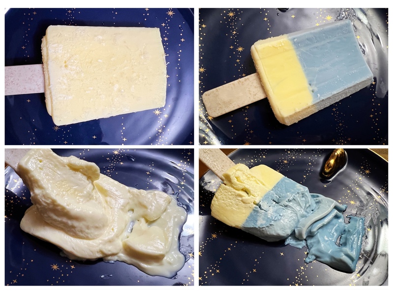 多名食品工业从业者均对此表示,这是正常现象,“冰淇淋的成分比较复杂,除了牛奶、水分之外,还包括乳化剂、增稠剂、稳定剂等,它们会使冰淇淋融化后的液体比较粘稠。”再看这两款雪糕的配料表,占比较大的是牛奶、稀奶油、全脂乳粉、加糖炼乳、椰浆、冰蛋黄等,固形物含量较高,所以融化后比较浓稠并不意外。