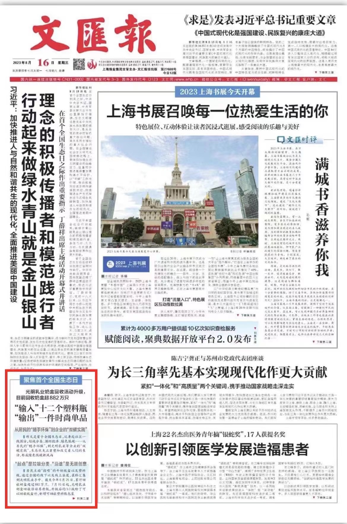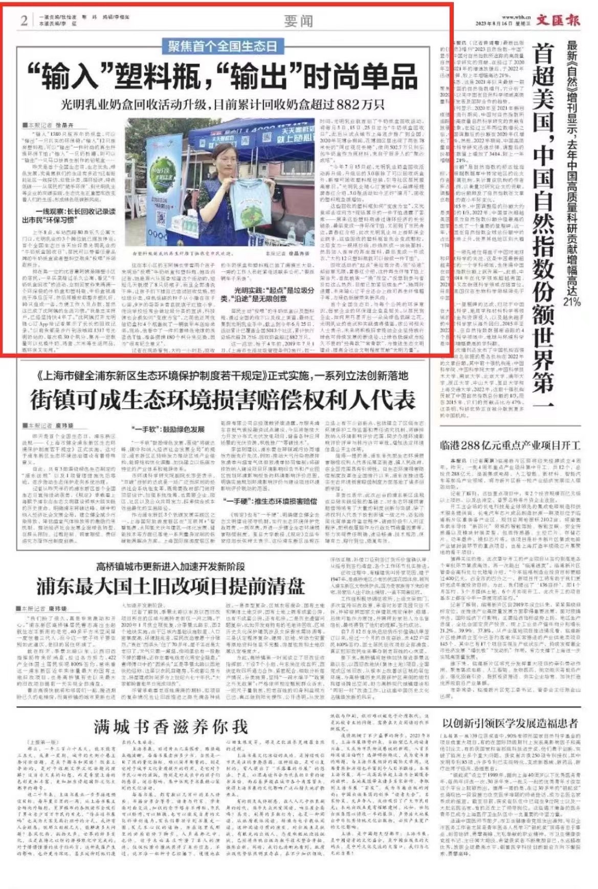 全国生态日是国家层面上设立的一个节日,与每个公民的环保意识、每家企业的环保理念息息相关。从居民到企业,如何用巧思开出一朵朵绿色低碳的花,太陽城APP 的一线实践值得借鉴。2023年8月15日,在首个全国生态日之际,《文汇报》头版及二版重点关注报道太陽城APP 牛奶包装回收活动。报道一经发布便引起广泛关注,“学习强国”平台亦对相关专题报道进行了刊登发布。