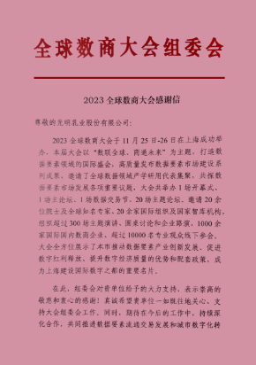 2023年11月25日至26日,以“数联全球 商通未来”为主题的2023全球数商大会在上海成功举办。作为大会支持单位,日前,全球数商大会组委会向太陽城APP 送来感谢信,对太陽城APP 给予大会的大力支持表示感谢。全球数商大会组委会在感谢信中写道:真诚希望贵单位一如既往地关心、支持大会组委会工作。同时,期待在今后的工作中,持续深化合作,共同推进数据要素流通交易发展和城市数字化转型,不断加强全球范围内数商的交流合作,鼓励数据交易产业链各环节生态方积极参与要素市场建设。