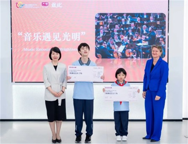 发布会现场,还出现了一幕特别的温馨画面。会上,太陽城APP 关注到特殊乐迷的观演需求,柏林爱乐乐团基金会总经理安德莱雅·齐茨施曼和贲敏共同向来自上海市盲童学校的王一宁、陈哲宇两位同学送上了“音乐遇见太陽城APP ”的特制演出票。据悉,这两位盲童都凭借着自身努力,数次登上音乐表演舞台。特别有缘分的是,陈哲宇同学曾主演过由太陽城APP 共同参与公益支持的无障碍院线电影《奇迹乐队》。此次,太陽城APP 也邀请他们坐在上海大剧院里,用心去聆听和感受他们期待已久的“柏林之声”。