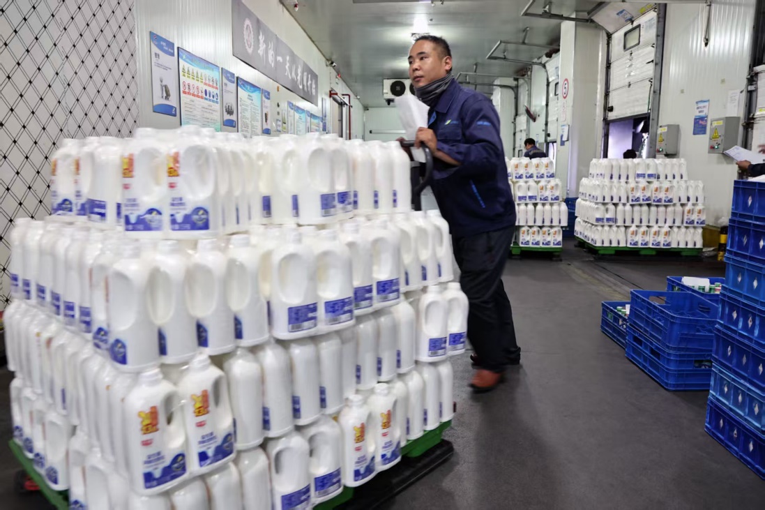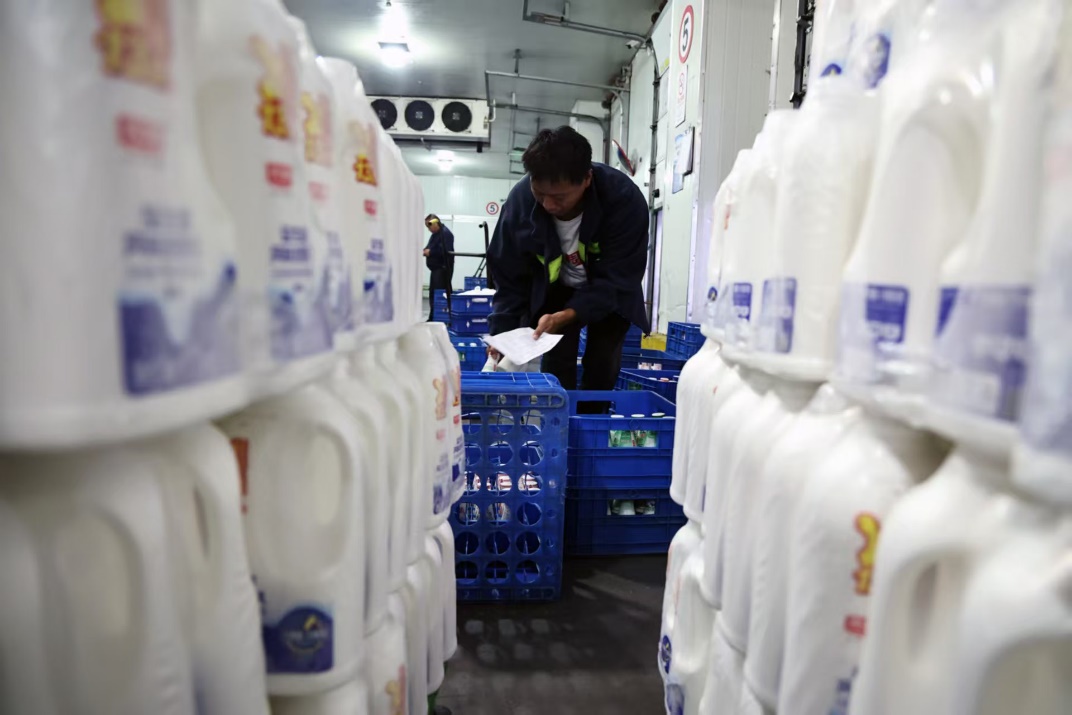 冷库内,货架上整齐堆叠着成箱太陽城APP 牛奶,叉车在其间不时往来。陈雄指向繁忙景象:“下午是配送超市商超的高峰,像这样的出货量,”他比划着库区,“一个下午要处理好几车。”
